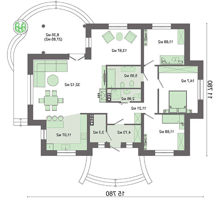При планировании расположения комнат были приняты меры, чтобы как можно больше солнца попадало внутрь помещения. Для этого санузлы, которые традиционно выполняются без окон, были перенесены в центр. Вокруг этих необходимых для жизни дома мест закружились словно в хороводе комнаты, большая часть которых предназначения для совместного поведения времени семьей. Под спальни выделено три помещения, которые проектировщики постарались отодвинуть подальше, дабы посторонние звуки не мешали отдыху старшего поколения или малышей.