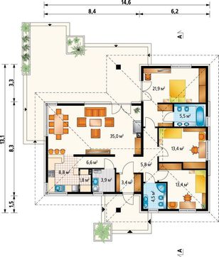 Проект содержит три раздела – АрхитектурныйКонструктивный и Инженерный: водоснабжение, отопление, вентиляция, канализация, электроснабжение (приобретается за дополнительную плату) + Пояснительная записка.