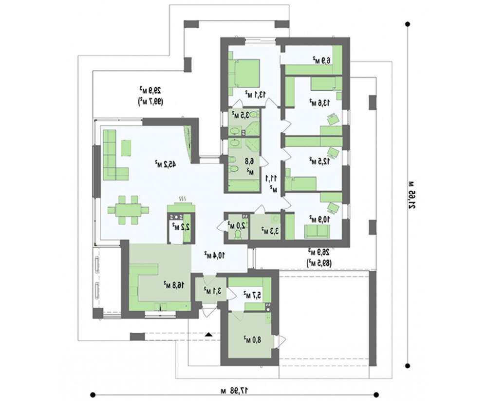 Проект содержит три раздела – АрхитектурныйКонструктивный и Инженерный: водоснабжение, отопление, вентиляция, канализация, электроснабжение (приобретается за дополнительную плату) + Пояснительная записка.