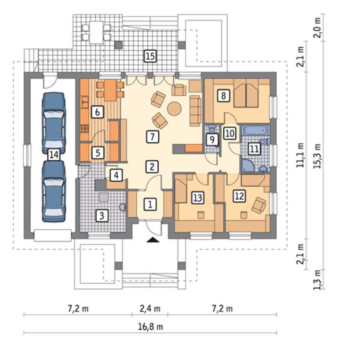 Проект содержит три раздела – АрхитектурныйКонструктивный и Инженерный: водоснабжение, отопление, вентиляция, канализация, электроснабжение (приобретается за дополнительную плату) + Пояснительная записка.