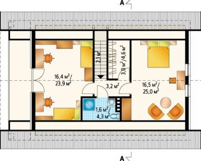 И тут ее внимательному взору открылся коттедж со стенами теплого желтого цвета, словно спелый подсолнух, длинным балконом на втором этаже и обилием дерева в облицовке торцов мансарды.