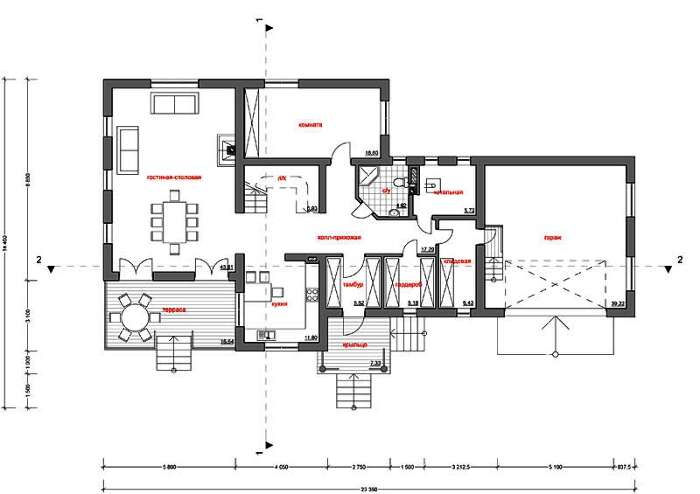 Проект содержит три раздела – Архитектурный, Конструктивный и Инженерный: водоснабжение, отопление, вентиляция, канализация, электроснабжение (приобретается за дополнительную плату) + Пояснительная записка.
