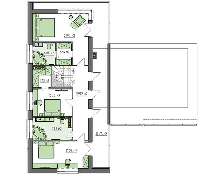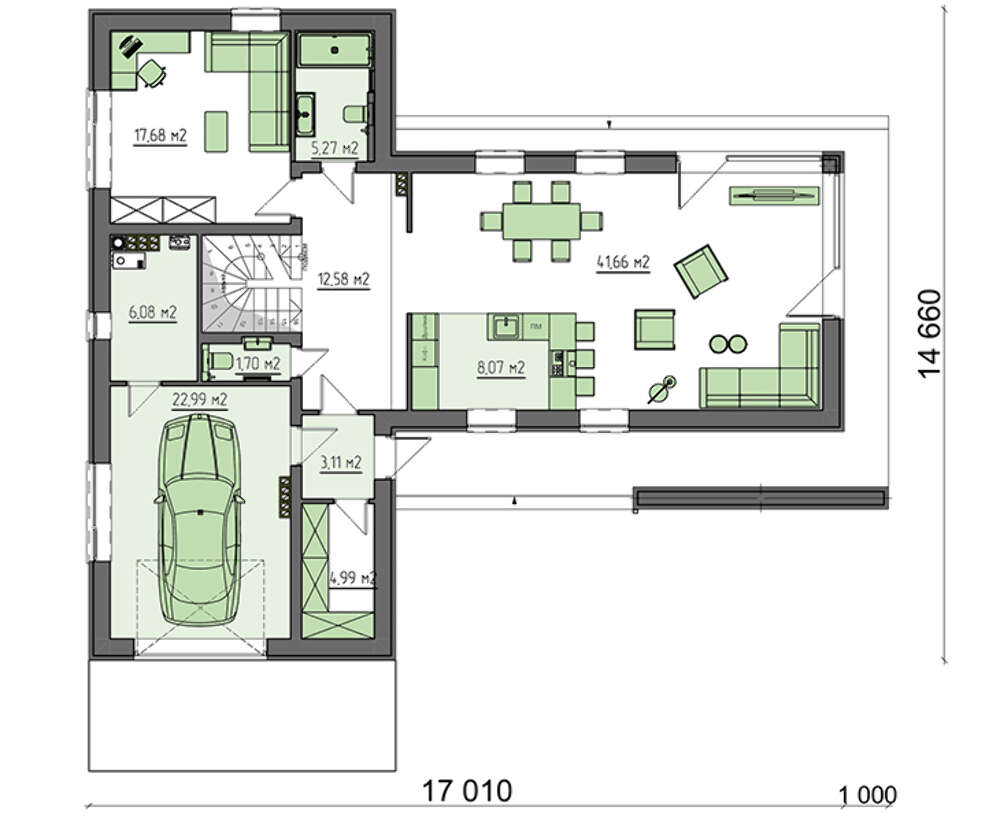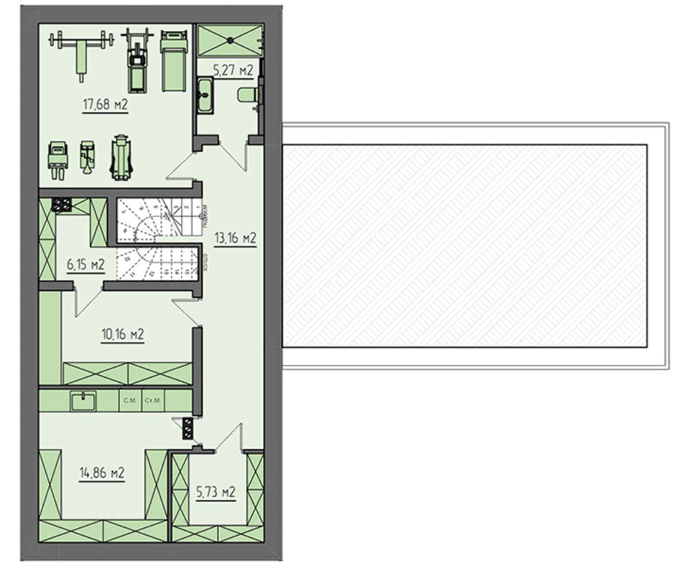 Проект содержит три раздела – Архитектурный, Конструктивный и Инженерный: водоснабжение, отопление, вентиляция, канализация, электроснабжение (приобретается за дополнительную плату) + Пояснительная записка.