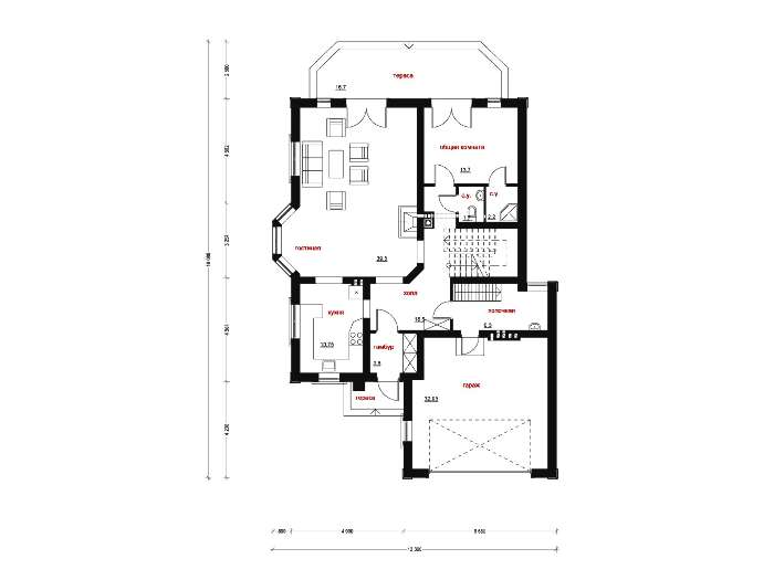 Проект содержит три раздела – Архитектурный, Конструктивный и Инженерный: водоснабжение, отопление, вентиляция, канализация, электроснабжение (приобретается за дополнительную плату) + Пояснительная записка.