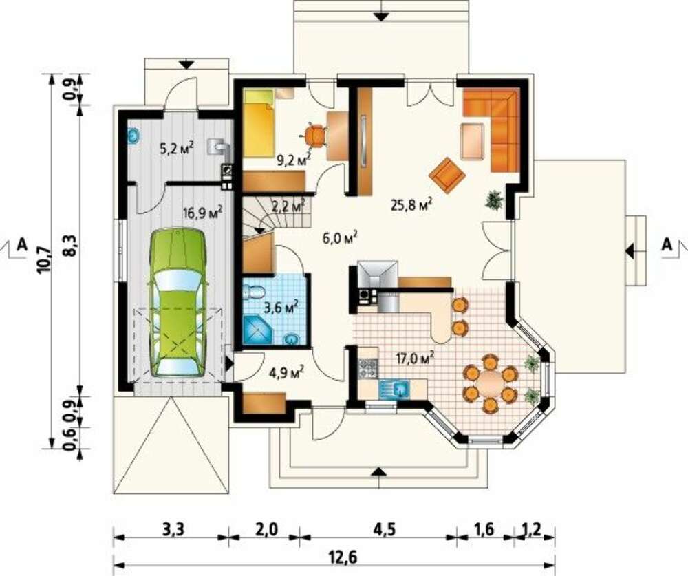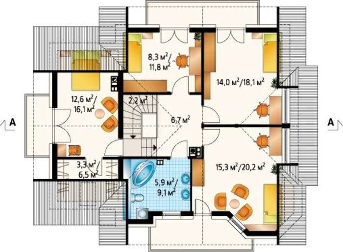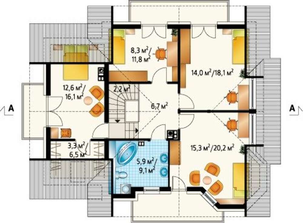 Рассмотрев великолепное здание снаружи пора открывать входные двери. В доме уважают автолюбителя и его проблемы. Гараж выполнен под одной крышей, выделена хорошая по размерам мастерская для решения автопроблем. Большая часть первого этажа отведена для проведения времени всей семьей. Помещение столовой вынесено внутрь эркера, что делает его необычно красивым. Особенность здания в большом количестве спальных комнат, их пять. Каждая расположена уединенно, все выделяются интересной планировкой, в апартаментах второго этажа имеются выходы на балкон.