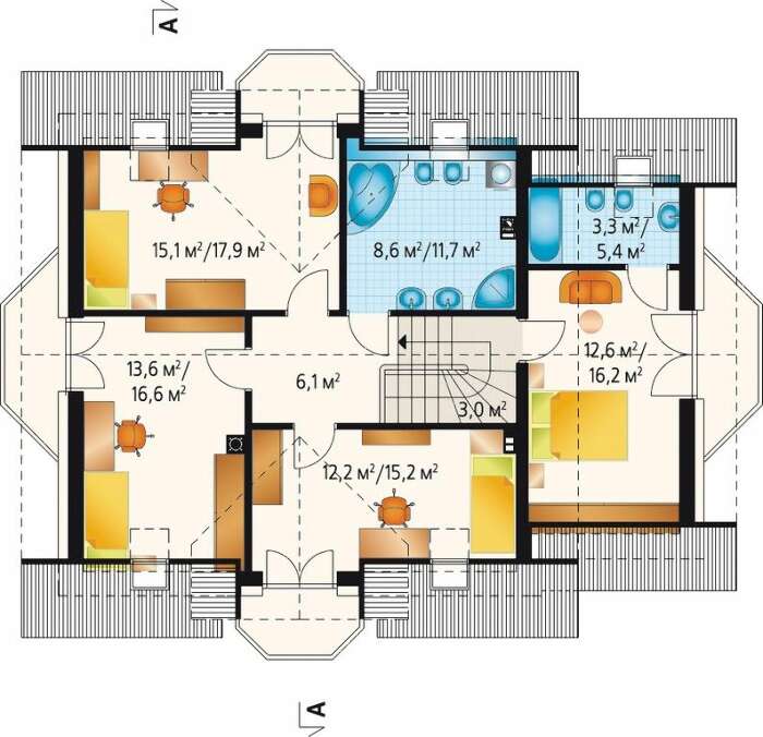 Второй этаж по всем правилам проектирования — зона для отдыха и сна. Этому способствуют четыре отдельные спальни. Особенность планировки в том, что все спальные пространства имеют собственный балкон, на каждую из сторон света выходит только одна навесная конструкция. Предаваясь отдыху, будь то встреча рассвета или наблюдение за покачивающимися кустами роз, можно не бояться быть потревоженным.