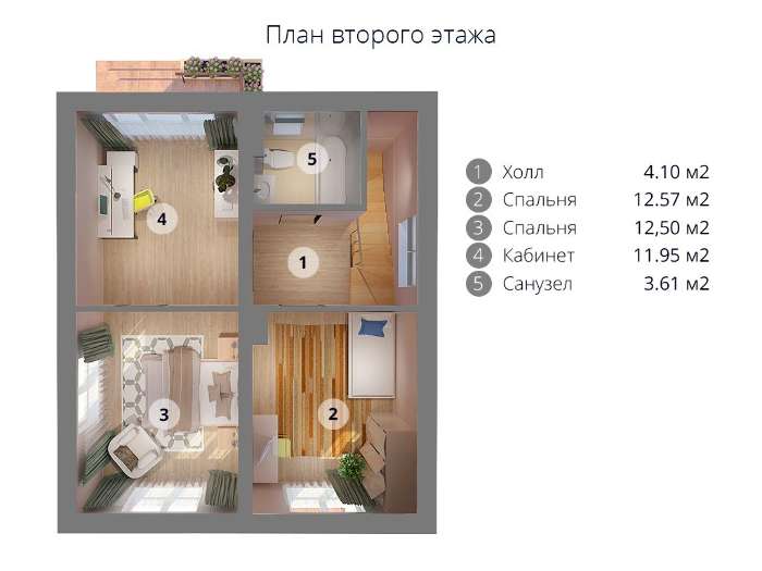 Пространство верхнего уровня разделено между детской комнатой, спальней хозяина и его рабочим кабинетом, небольшим коридорчиком и санузлом.