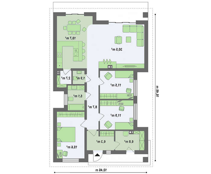 Дом просторный и функциональный. Проект рассчитан на проживание среднестатистической украинской семьи, а это означает, что у каждого обитателя дома будет отдельная спальня. В планировке коттеджа их три. Большая площадь отведена гостиной зоне. Это просторное помещение, в котором хозяева могут принимать друзей и родственников, устраивать вечеринки и праздновать семейные торжества. Кухня и находящаяся рядом кладовая для хранения продуктов, позволит легко готовить вкуснейшие блюда, быстро сервировать стол, организовать фуршет или просто подать гостю чашечку кофе. Остальная площадь дома разделена между подсобными помещениями.