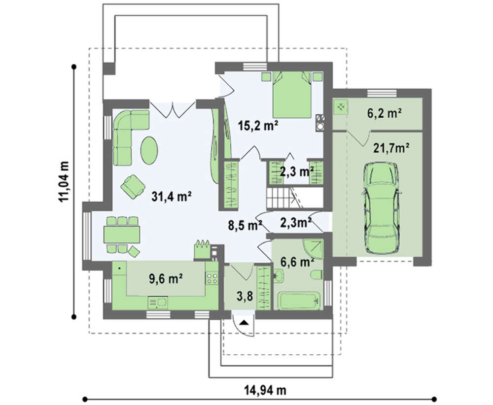 Чертеж симпатичного коттеджа площадью 184 кв. м с пристроенным гаражом