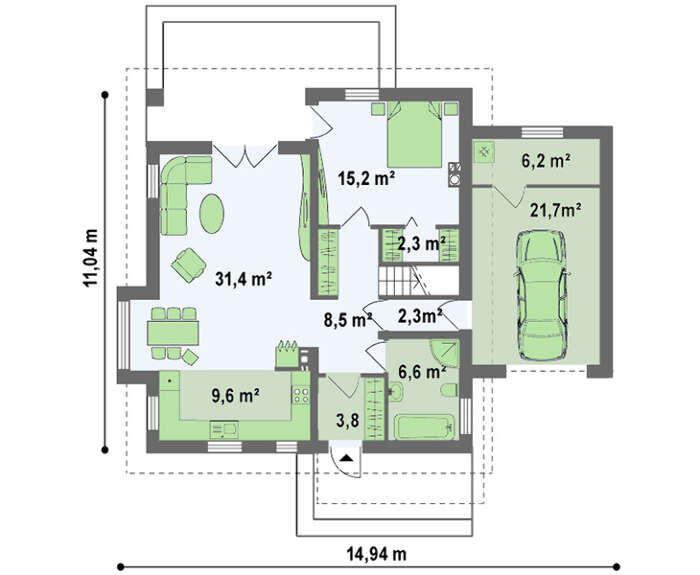 Проект содержит три раздела – АрхитектурныйКонструктивный и Инженерный: водоснабжение, отопление, вентиляция, канализация, электроснабжение (приобретается за дополнительную плату) + Пояснительная записка.