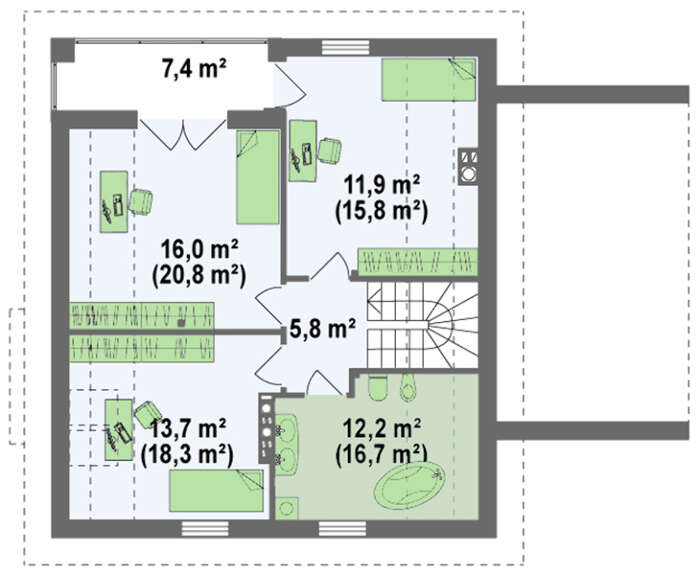 • 4M7140 Чертеж симпатичного коттеджа площадью 184 кв. м с пристроенным гаражом