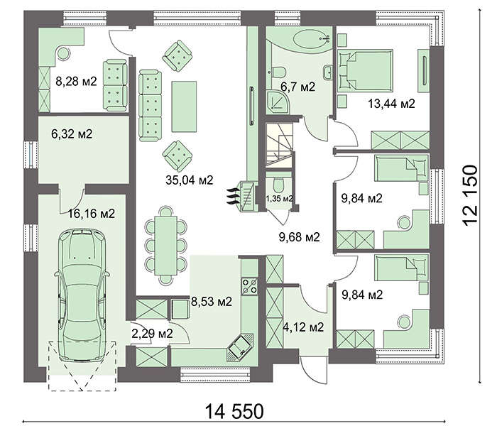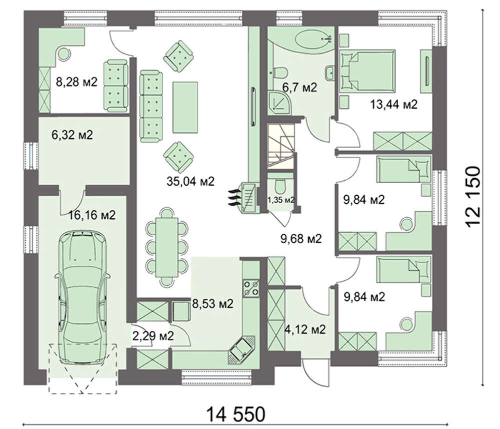 Особенностью жилого дома стал просторный гараж. Впоследствии его площадь можно переоборудовать под жилую комнату, тем самым расширить полезное пространство. Или реконструировать, часть гаража, и поместить сауну или хаммам.