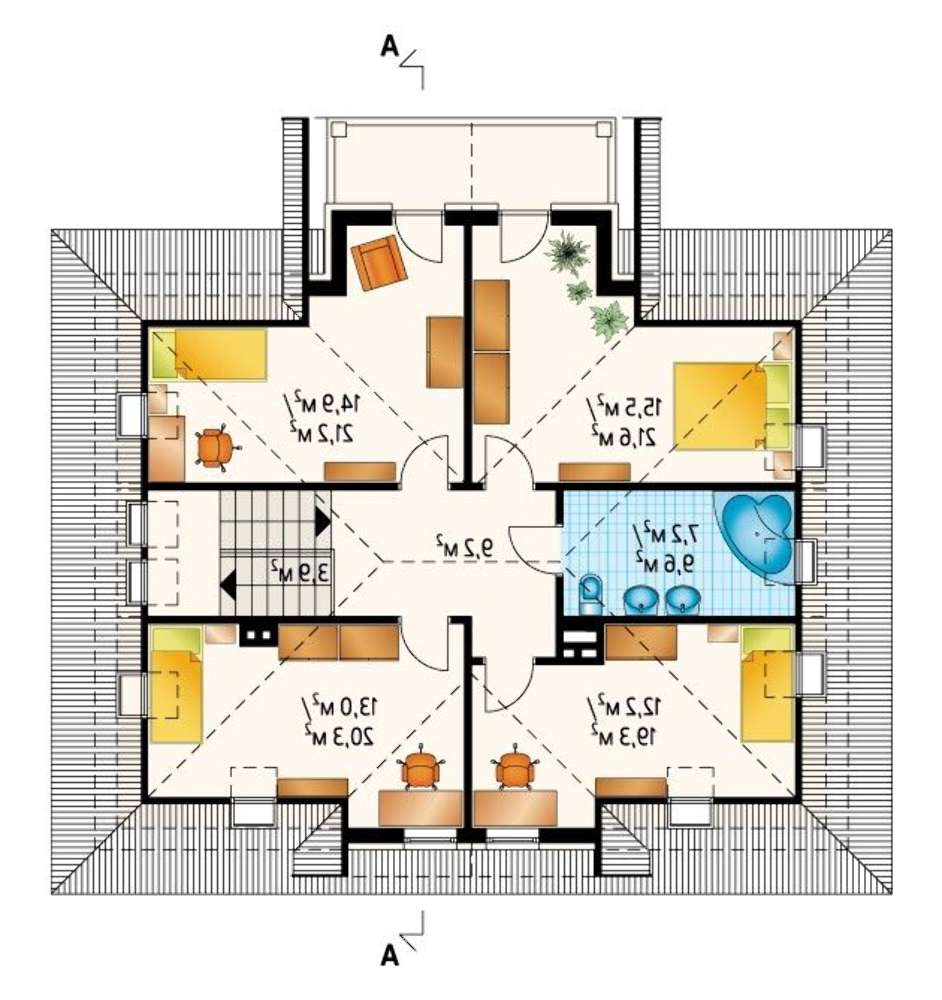 Второй этаж помещает достаточное количество спален для всех членов небольшой семьи. Здесь четыре комнаты, две из которых за счет соединяющего балкона выгодно отличаются. Их хозяева получают возможность много времени проводить на свежем воздухе, получать удовольствие от просматривания прессы или литературных произведений, принимать солнечные ванны или выпивать чашку утреннего бодрящего кофе.