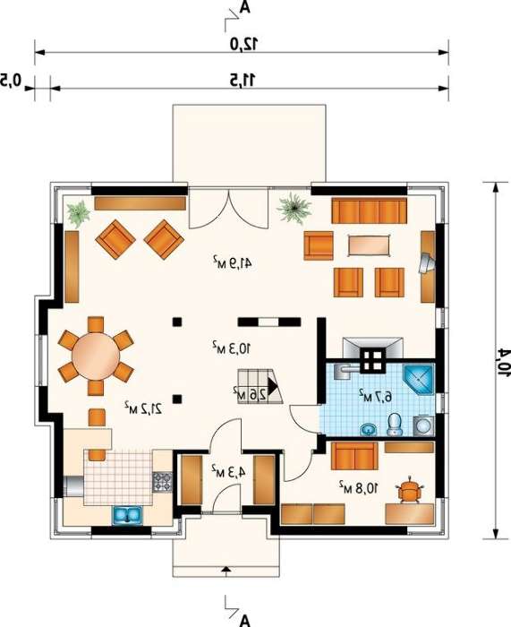 Практически все пространство первого этажа отдано под зону дружеских и родственных приемов. Для того чтобы участки разного функционального назначения разделить, они разнесены по угловым пространствам. Максимально удаленная зона отдана под кухню, здесь можно в тишине готовить вкусные блюда, при этом наблюдать за всеми происходящими в комнате действиями, поддерживать разговор и сервировать хлебосольный обед.