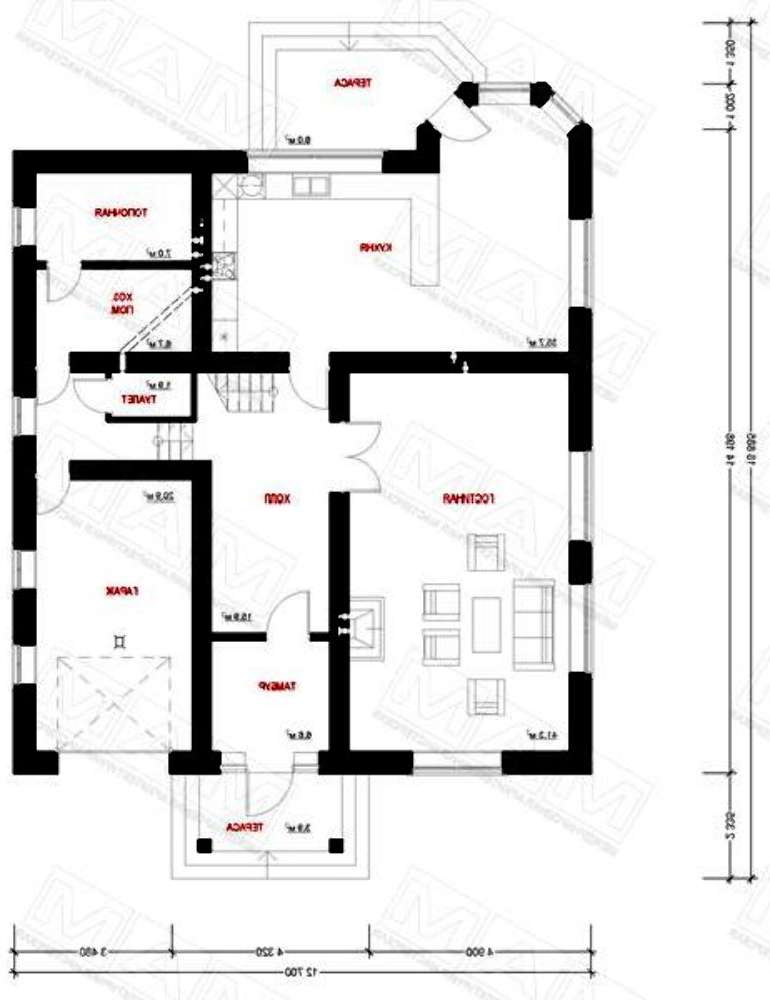 Дом 4М819 именно такой: добротный, крепкий и надежный. «Крепость» в два этажа с вальмовой четырехскатной крышей. Изюминкой дома является трехгранный ризалит на первом этаже с большими окнами и выходом на террасу. Он увеличивает пространство дома и улучшает его освещение. На втором этаже ризалит заканчивается балконом с современными, горизонтальными, металлическими перилами. Есть в этой крепости и гараж с подъемными воротами. Здорово украшает дом каменная кладка на цоколе и дымоходах. Она словно ненавязчиво подчеркивает, что этот дом действительно крепость.