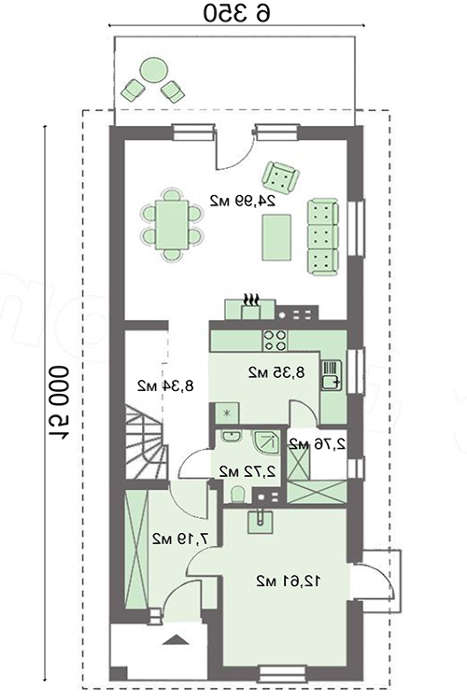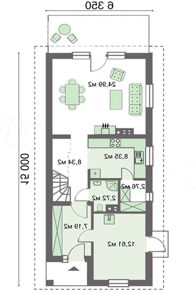 Торцевая часть дома отдана под столовую и гостиную. Центральная определена под камин — символ домашнего очага и отопительный прибор одновременно. Отдельный выход на загородный участок позволяет хозяевам и их приятелям любую встречу продолжить на территории усадьбы, наслаждаться пением птиц, жужжанием пчел и бесконечно долго наблюдать за порханием бабочек.