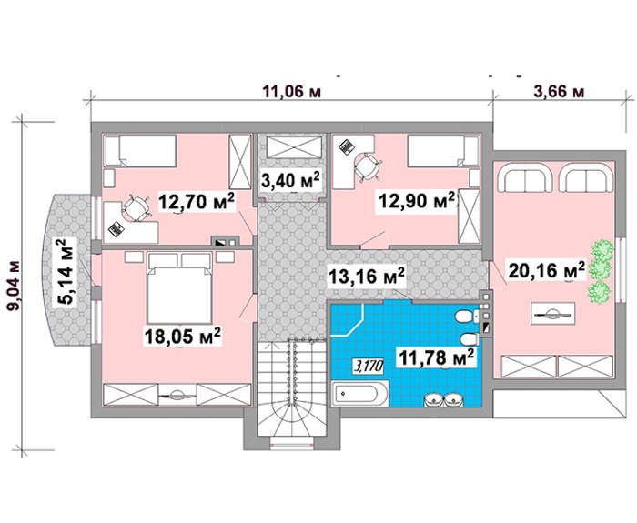 Второй этаж представлен 4 спальными помещениями, все довольно просторные и комфортные. Компактный гардероб поможет хранить солидные запасы нарядов для всех членов семьи. Две комнаты соединены красивым балкончиком Ажурная конструкция смотрится стильно и празднично, украшая жилой дом. Просторная санитарная комнаты поможет разместить самое современное оборудование.