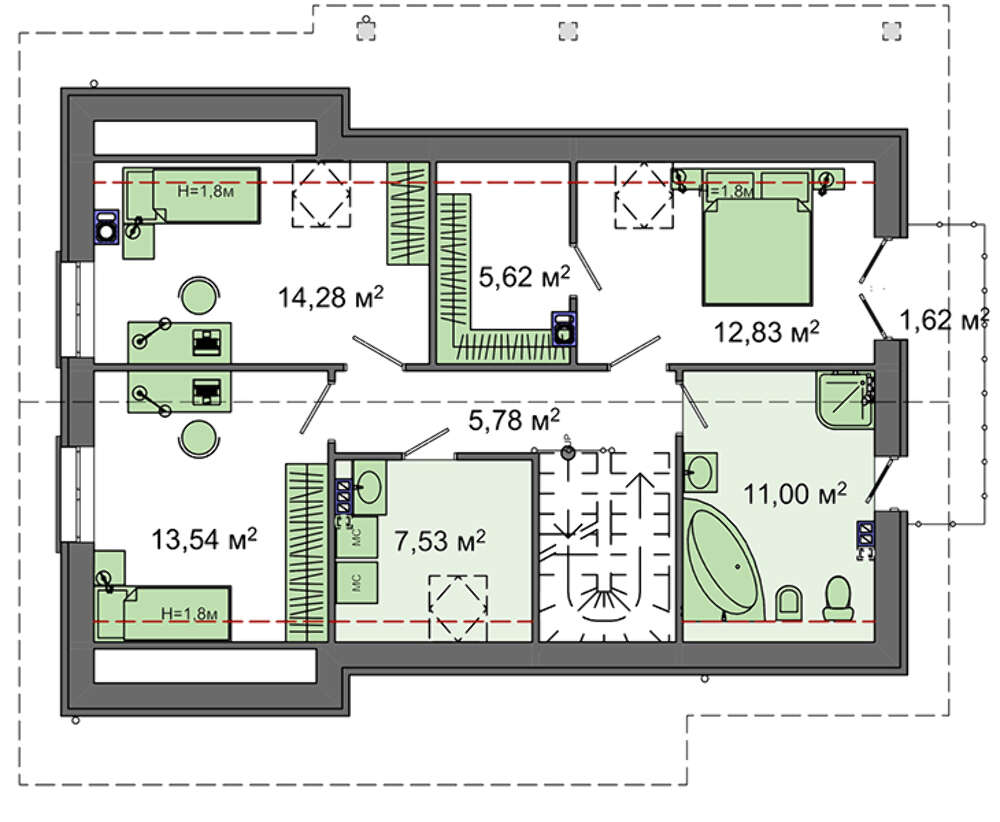 Четыре спальных помещения разнесены на разные этажи. Расположенная на нижнем уровне спальня прекрасно подойдет для старшего поколения. Комнаты верхнего будут высоко оценены молодежью. Наличие балконов делает их особенно привлекательными.