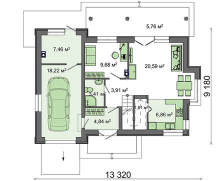 На первом этаже размещены помещения разного назначения. Гаражная площадь достаточная для содержания одной единицы транспорта. В размеры гостиной включена столовая и кухня. Угловое расположение и частичное ограждение помогают защитить жилую площадь от навязчивых запахов готовящихся блюд. Эркерная зона будет наилучшим место для обеденного стола. Красивые картины природы благотворно влияют на пищеварение и превращают трапезу в праздничное мероприятие.