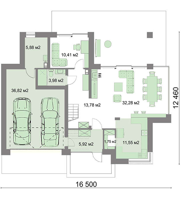 Жилое пространство поделено на ночную и дневную зоны. Простор гараж рассчитан на две единицы авто, прилегающее помещение рекомендуется использовать для хранения инструмента. Предусмотрена отдельная площадь для комнаты отдыха или бизнес-кабинета, где чувствуя поддержку семьи, хозяин сможет заключать важные договоры и вести деловые беседы.