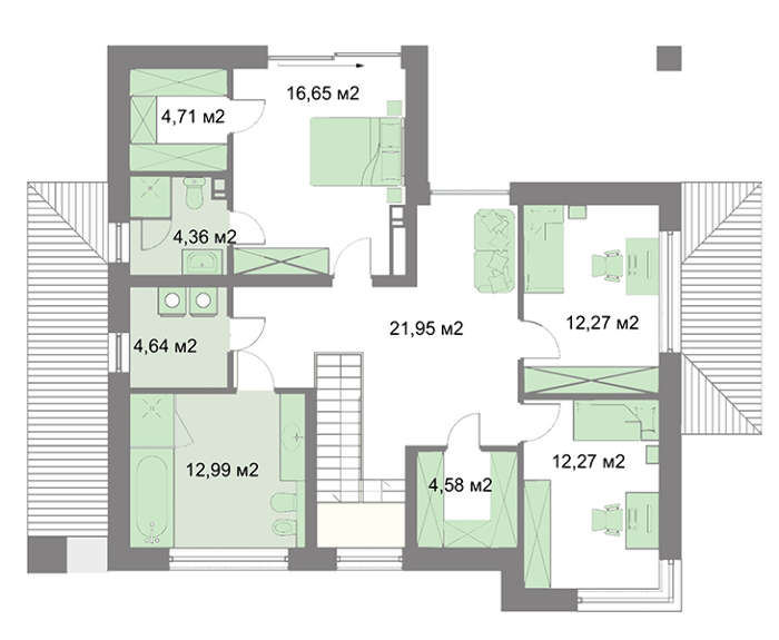 Спальные помещения находятся на верхнем уровне, одна из комнат выгодно выделяется личным гардеробом и санузлом. Особенность второго этажа в просторной зоне отдыха, доступной для всех проживающих.