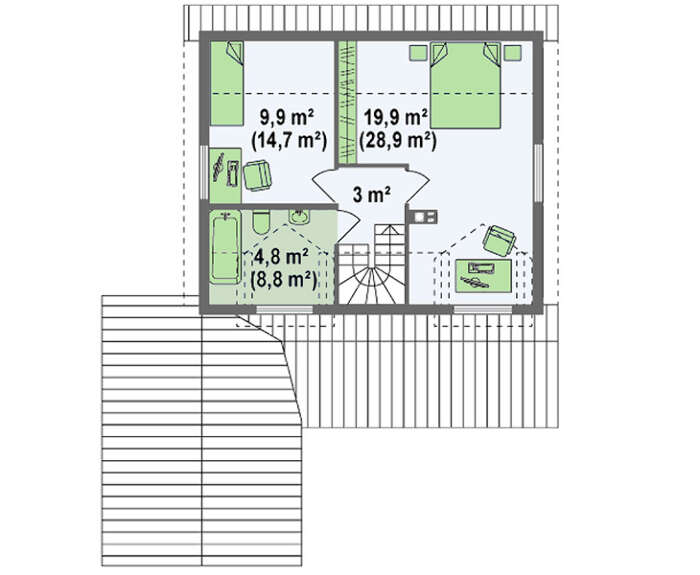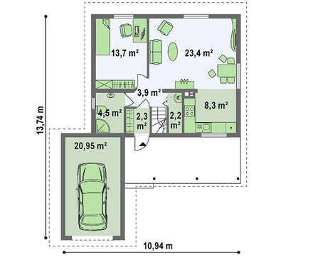 Симпатичный коттедж с мансардой и пристроенным гаражом в стиле финской архитектуры подойдет для застройщиков, предпочитающих естественность и экологичность. Благодаря натуральным материалам дом идеально впишется в любой ландшафт. Функциональные возможности коттеджа удовлетворяют потребностям молодой семьи. Будущие застройщики приобретают проект как для возведения сезонной дачи, так и для строительства полноценного круглогодичного дома. Наличие действующего камина и помещения топочной снимает проблему отопления жилья в холодное время года.