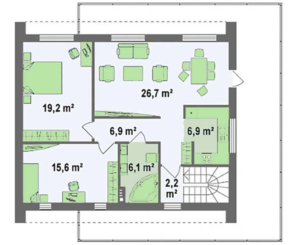 Уникальность жилья в независимости этажей друг от друга. Каждый из них имеет свою общую зону, представленную кухнею и гостиною. Это позволяет в доме поселиться близким родственникам, которые предпочитают много времени проводить вместе, но выбирают раздельное ведение хозяйство. Такой способ жизни характерен для семьи, у которых имеется самостоятельное старшее поколение. В дневное время проживающие на первом этаже бабушка и дедушка большую часть времени могут проводить с внучатами, которые ближе к ночи перебираются на торой этаж, в царство мамы и папы.