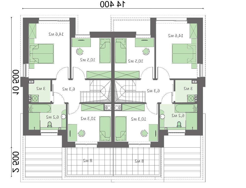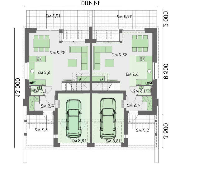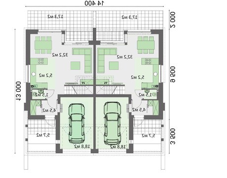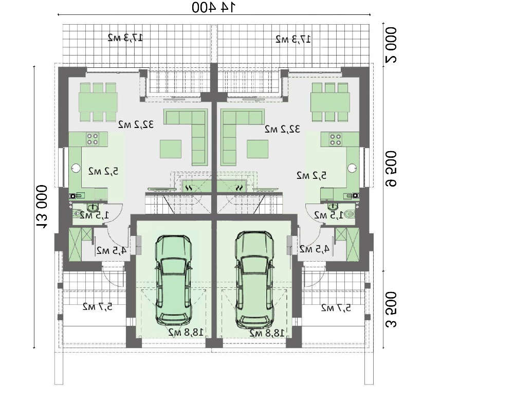 Обе квартиры расположены под одной крышей, но выполнены симметрично. Рассчитанные на одно авто гаражи, размещены с черного хода, шум машин не нарушает привычны образ жизни обитателей. Простор гостиной зоны достигается за счет соединения в одно помещение всего пространства для проведения общего времени.