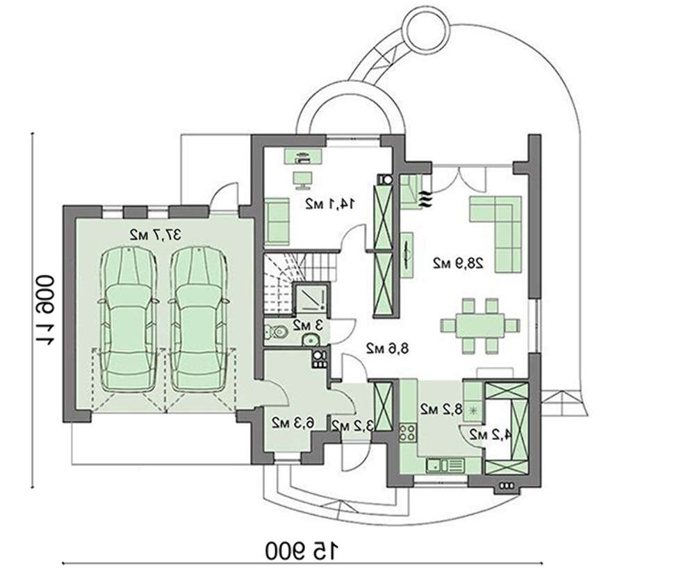 На первом этаже размещены требуемые для дневного времени комнаты. Гаражное пространство рассчитано на две единицы транспорта. Подсобное помещение идеально подойдет для хранения инструмента. Место для дневного отдыха получено при соединении столовой и гостиной. Под приготовление пищи отведено полуоткрытое помещение, прилегающая кладовка отлично справится с хранением припасов и бытовой техники.