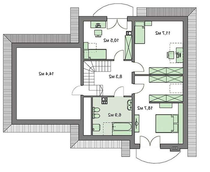 Внутреннее пространство разумно разделено на помещения. Найдено место всем необходимым для комфортного проживания комнатам. При надобности к полезной площади можно добавить территорию чердака и использовать мансарду на усмотрение хозяина.