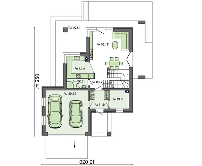 Пространство жилого дома строго разделено на область коллективного общего времяпрепровождения и сугубо личные жилые апартаменты. Первый этаж в свои размеры включает просторный гараж на два автомобиля. Необычная по форме гостиная выполнена в Г-образной конфигурации. Отдаленное угловое размещение кухни будет высоко оценено хозяйкой. Такая планировка ей позволит в тишине и покое готовить пищу, в то же время, довольно быстро накрывать солидные праздничные столы, контролировать все происходящие на этаже события.