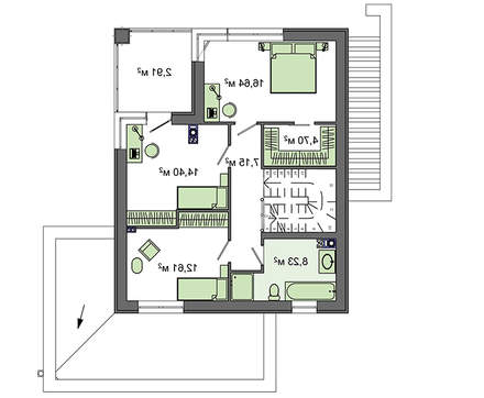 Второй этаж представлен тремя личными комнатами. Небольшие по размерам, они выделяются площадью и планировкой, имеют достаточно места для размещения потребной мебели и гардеробов. Просторная санитарная комната рассчитана на установку современного оборудования для приема водных процедур.