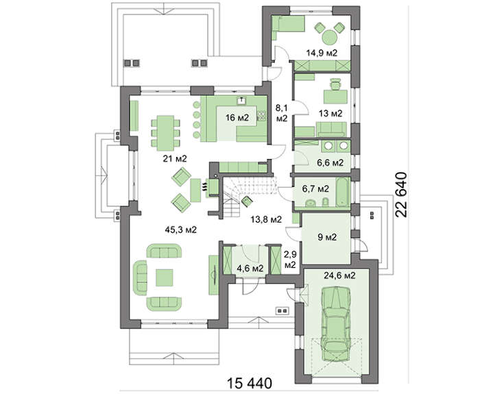 Общая площадь жилого дома оформлена в виде кухни-студии. Центральную часть отдана камину, тепло которого распространяется на все помещение. Зона кухни приобрела значительные размеры. Площадь в 16 м2 достаточна для приготовления пищи, расстановки самого прогрессивного кухонного оборудования и организации семейных обедов и завтраков.