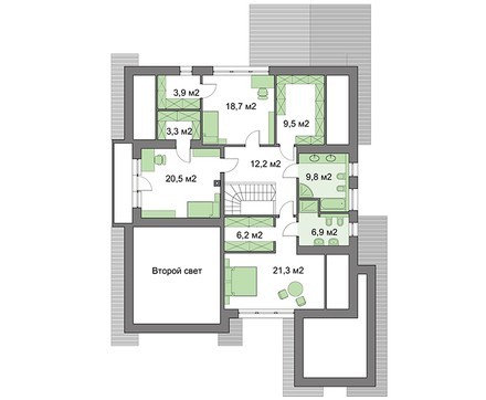 Жилой дом имеется достаточно личных комнат. Две спальни вместе с санузлом вынесены в единый блок первого этажа. Отдельный выход позволяет хозяевам вести независимый образ жизни. Комнаты второго уровня имеют большие размеры, каждая расширена за счет собственного гардероба. Хозяйские апартаменты отмечены личным санузлом.
