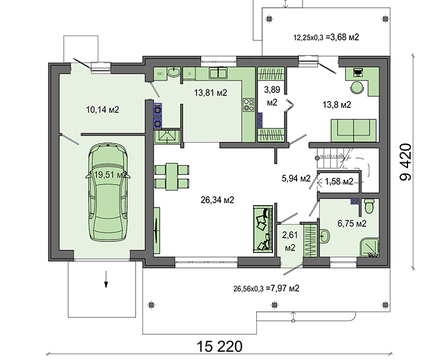 В планировке первого этажа учтены все необходимые для проживания помещения. Имеется гараж для размещения одной машины и просторная мастерская, чтобы ее обслуживать. Зона отдыха представлена гостиной на 26 квадратов. Рядом размещена кухня, предусмотрено помещение для хранения снеди и кухонного оборудования. Небольшие размеры личной комнаты на первом этаже компенсируются за счет собственного гардероба, где можно хранить существенные запасы вещей.