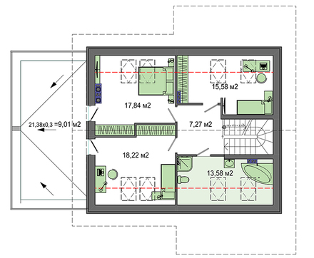 Второй уровень включает три спальных помещения. Просторные и уютные, они имеют практически одинаковую площадь. Две комнаты более комфортные за счет балкона.