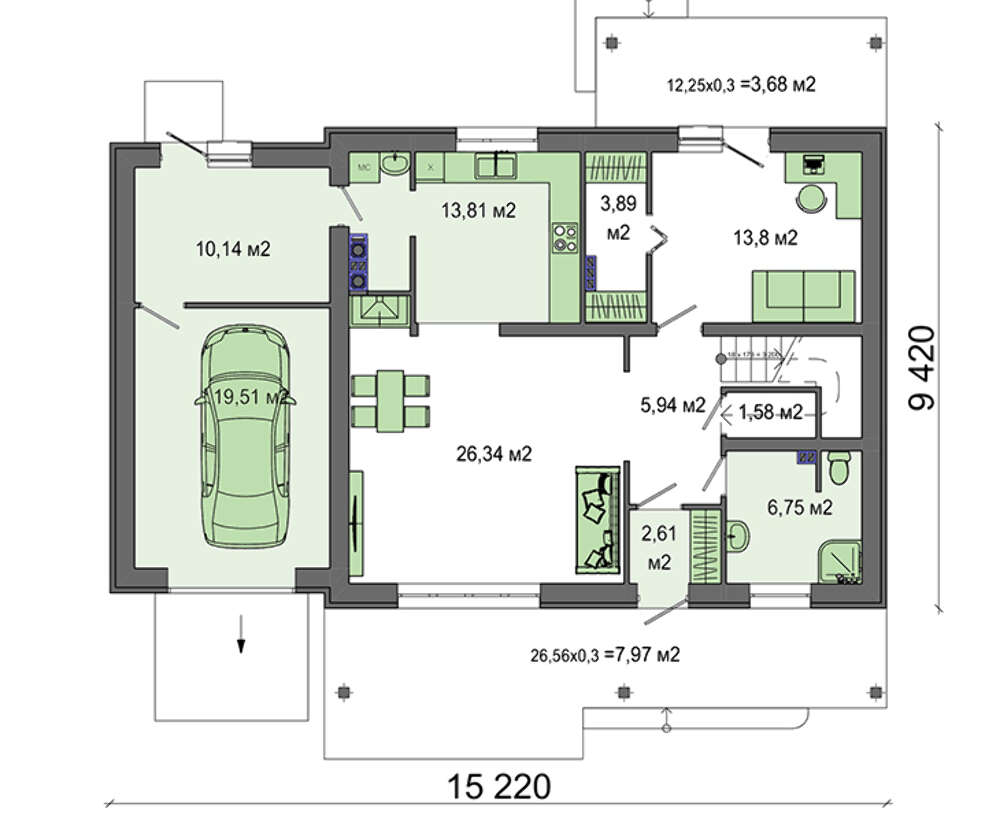 В планировке первого этажа учтены все необходимые для проживания помещения. Имеется гараж для размещения одной машины и просторная мастерская, чтобы ее обслуживать. Зона отдыха представлена гостиной на 26 квадратов. Рядом размещена кухня, предусмотрено помещение для хранения снеди и кухонного оборудования. Небольшие размеры личной комнаты на первом этаже компенсируются за счет собственного гардероба, где можно хранить существенные запасы вещей.