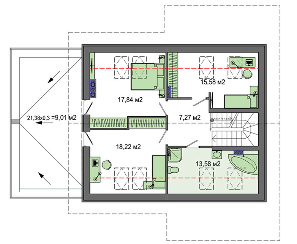 Второй уровень включает три спальных помещения. Просторные и уютные, они имеют практически одинаковую площадь. Две комнаты более комфортные за счет балкона.