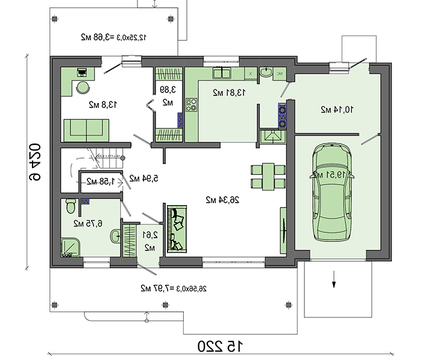 В планировке первого этажа учтены все необходимые для проживания помещения. Имеется гараж для размещения одной машины и просторная мастерская, чтобы ее обслуживать. Зона отдыха представлена гостиной на 26 квадратов. Рядом размещена кухня, предусмотрено помещение для хранения снеди и кухонного оборудования. Небольшие размеры личной комнаты на первом этаже компенсируются за счет собственного гардероба, где можно хранить существенные запасы вещей.