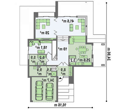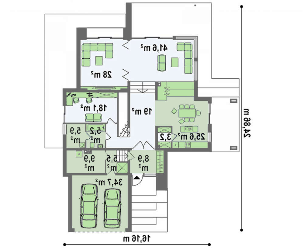 Внутреннее пространство первого этажа за счет рационального разделения площади относится к универсальным. Большой гараж рассчитан на размещение двух автомобилей, для хранения инструмента и выполнения сервисных работ имеется прилегающая мастерская. Просторная гостиная зона располагает собственным выходом на приусадебный участок. Гости и друзья смогут часть времени или пиршества проводить среди изящной растительности в тени стройных деревьев. Приготовленные на свежем воздухе куски мяса и овощи не только разнообразят меню, но и сделают встречу запоминающейся, неповторимой.