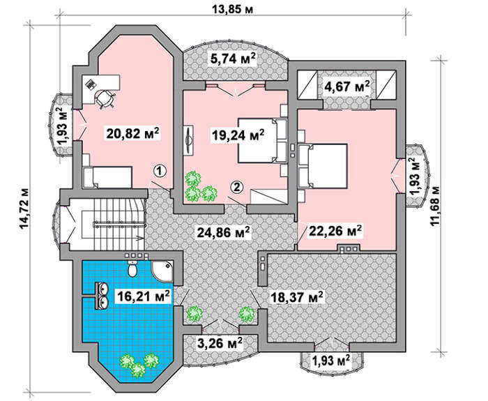 С прихожей гость проходит в просторный коридор, из которого можно войти в огромную гостиную в 40 кв. метров. Особым шиком зала считается зимний сад, размещенный в эркере и камин в центре. По коридору попадаешь в спальную зону, состоящую из двух комнат. В одной из них можно организовать кабинет, другую рекомендуется оставить для задержавшихся гостей.