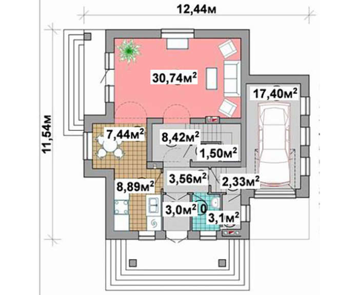 В эркере устроена столовая, что позволяет во время трапезы наслаждаться красивым пейзажем усадьбы. К ней прилегает просторная кухня почти на 10 кв. м, оснащенная современной бытовой техникой. В пристройке разместился гараж для автомобиля. Остальную площадь этажа занимает санузел, котельная, прихожая и небольшой холл с лестницей.