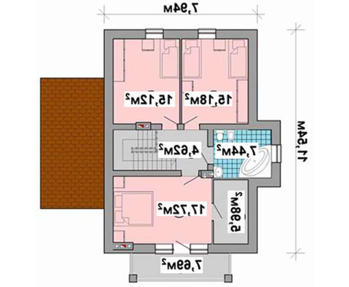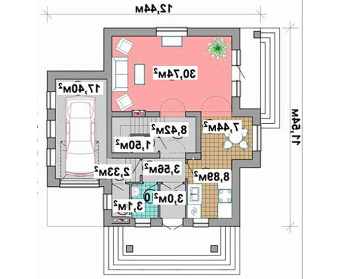 В эркере устроена столовая, что позволяет во время трапезы наслаждаться красивым пейзажем усадьбы. К ней прилегает просторная кухня почти на 10 кв. м, оснащенная современной бытовой техникой. В пристройке разместился гараж для автомобиля. Остальную площадь этажа занимает санузел, котельная, прихожая и небольшой холл с лестницей.