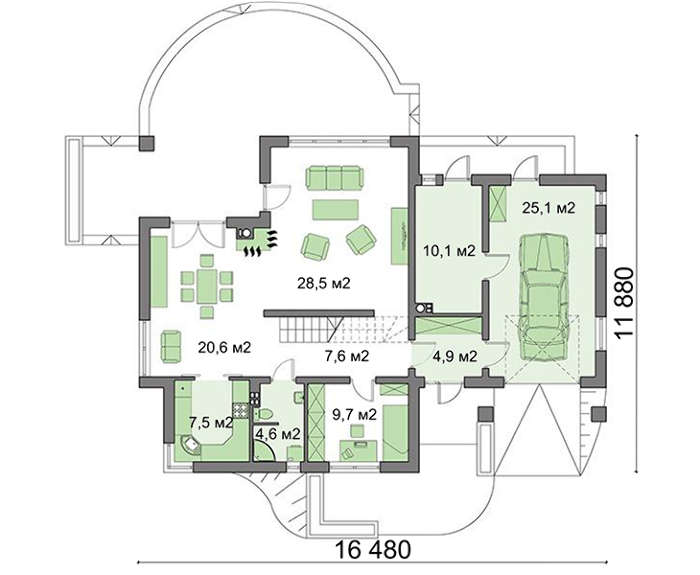 Первый этаж условно делится на основную и вспомогательную площадь. Главная часть включает зону отдыха. Здесь найдется место для мягкой мебели и домашнего кинотеатра, столовой с обеденным столом и удобным диваном. Кухня, спальня и санитарная комната расположены отдельно.