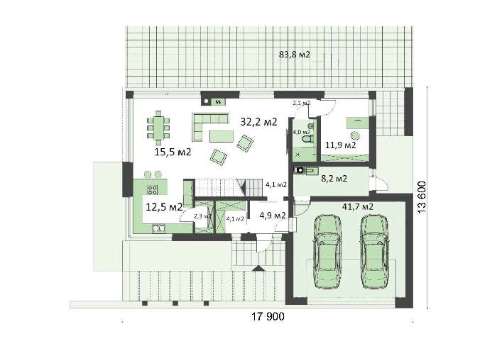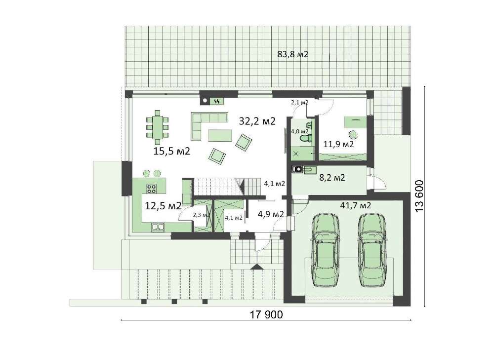 В пространство первого этажа входит гараж, простора которого достаточно для размещения с комфортом двух машин.