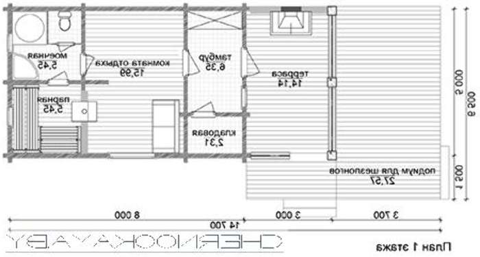 Самую большую площадь в 16 кв. м. занимает комната отдыха с удобной мебелью, столом и самоваром для после процедурных чаепитий. При входе расположен предбанник. Он в то же время служит и тамбуром. При эксплуатации бани в холодное время года он убережет баню от утески тепла и появления сквозняков. Рядом с ним находиться гардеробная комната, где парильщики могут раздеться.