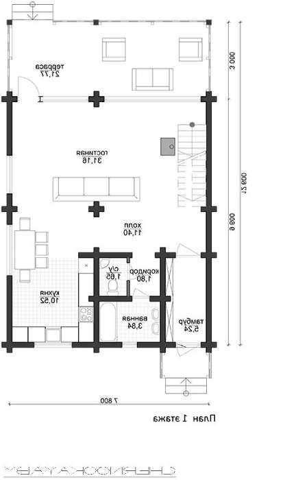 Внутреннее пространство дома максимально функционально. Центральную часть первого этажа занимает гостиная со вторым светом, который придает помещению эффектной солидности. Камин в середине комнаты служит воплощением домашнего очага. Вокруг него долгими осенними вечерами собирается вся семья. Кроме того, камин играет роль альтернативного отопления.