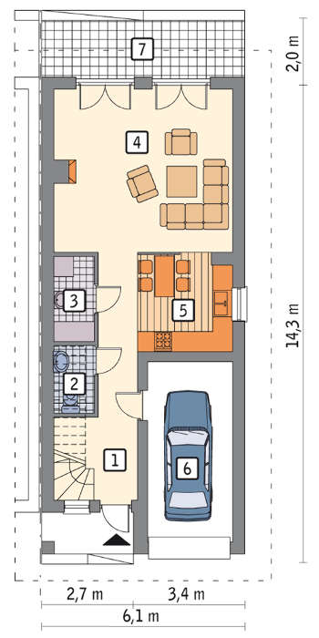 Просторное помещение кухни – столовой позволяет не только оборудовать зону для приготовления пищи, но установить большой обеденный стол для семейных трапез. Остальную площадь нижнего уровня занимает гараж для автомобиля представительского класса, раздельный санузел и просторный коридор с лестницей на второй этаж.