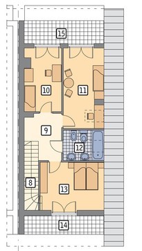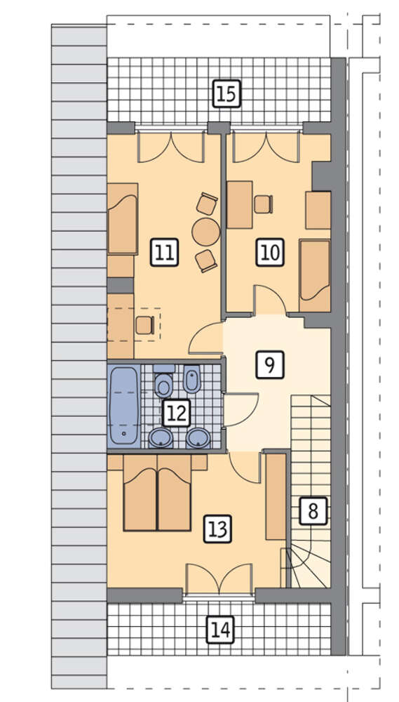 Верхний уровень отведен под личное пространство членов семьи. Здесь располагаются три спальни, каждая с отдельным выходом на балкон, небольшой холл и общее санитарное помещение с ванной.