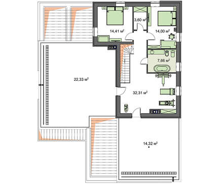 Планировка жилого дома отличается от привычной. Второй этаж, помимо трех спальных помещений, включает спортивный зал. Его большая площадь рассчитана на размещение достаточного количества тренажеров, беговых дорожек. Два выхода на громадные террасы позволяют жильцам большую часть времени проводить на природе, в утренней зыбке встречать красивые рассветы, наблюдать за грустным моментом ежедневного ухода на покой небесного светила. Площадь рассчитана как на шумные вечеринки под открытым небом, так и милые детские утренники. Стеклянные ограждения обеспечат безопасность окружающих.